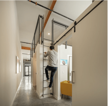 The converted space sits atop the iconic 4th Street Market along the new light-rail corridor. The project engages with the pedestrian-oriented street below through roll-up garage doors and cantilevered balconies. The studio units feature expansive openings, full kitchens, and elevated sleeping areas.